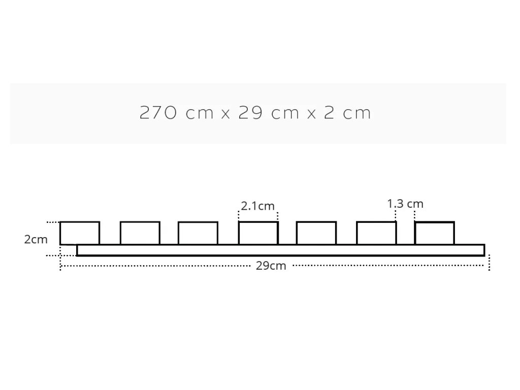 Obkladový panel je v odstínu dub medový s černou o délce 2,7 m a šířce lamely 290 mm. Materiál je velmi lehký, pevný, vysoce odolný vůči oděru a má zvukově izolační vlastnosti.