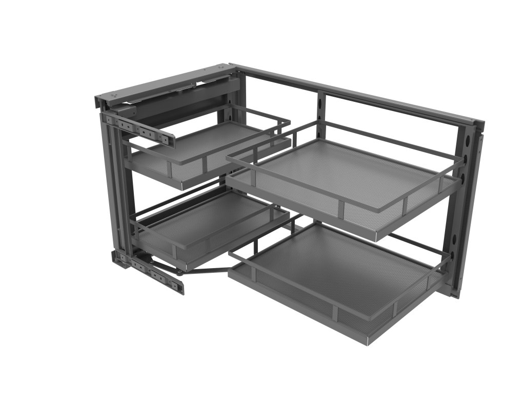 Výsuvný rohový koš s plným dnem do spodní rohové skříně kuchyně v antracitové barvě. Koš má plné dno a protiskluznou antracit podložku AntiSlip. K rychlé montáži poslouží 3D úchyty čela. Koš je v dostání pro šířku skříně 900 a 1000 mm.