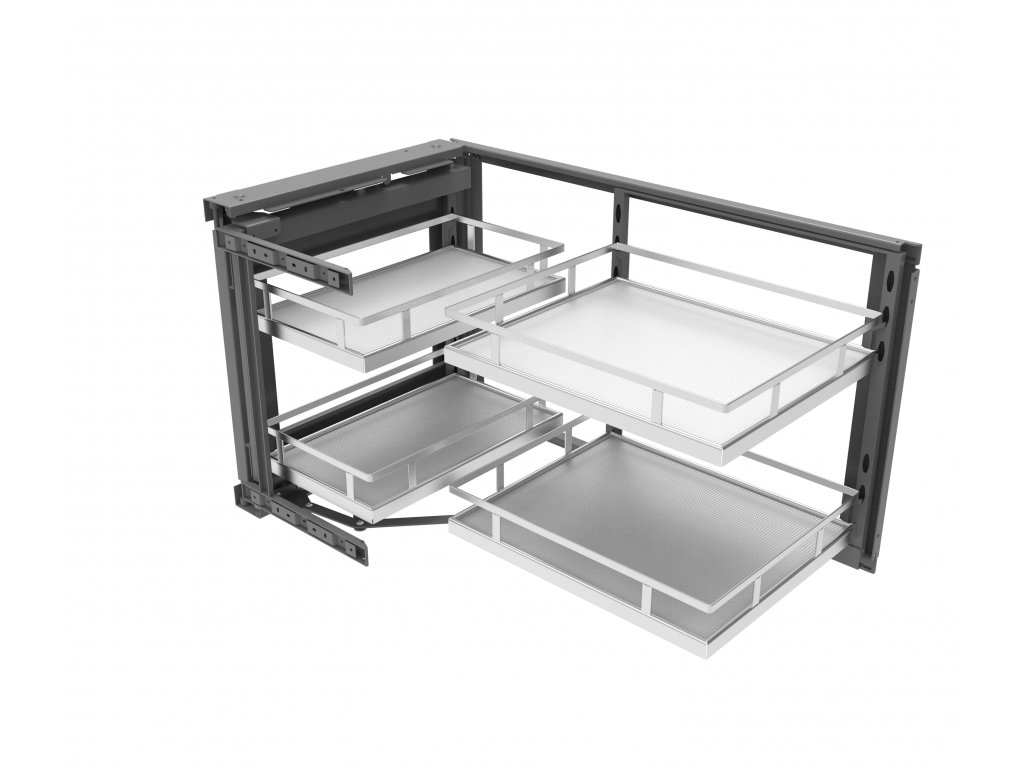 Výsuvný rohový koš s plným dnem do spodní rohové skříně kuchyně v chrom/bílé barvě. Koš má plné dno a protiskluznou bílou podložku AntiSlip. K rychlé montáži poslouží 3D úchyty čela. Koš je v dostání pro šířku skříně 900 a 1000 mm.