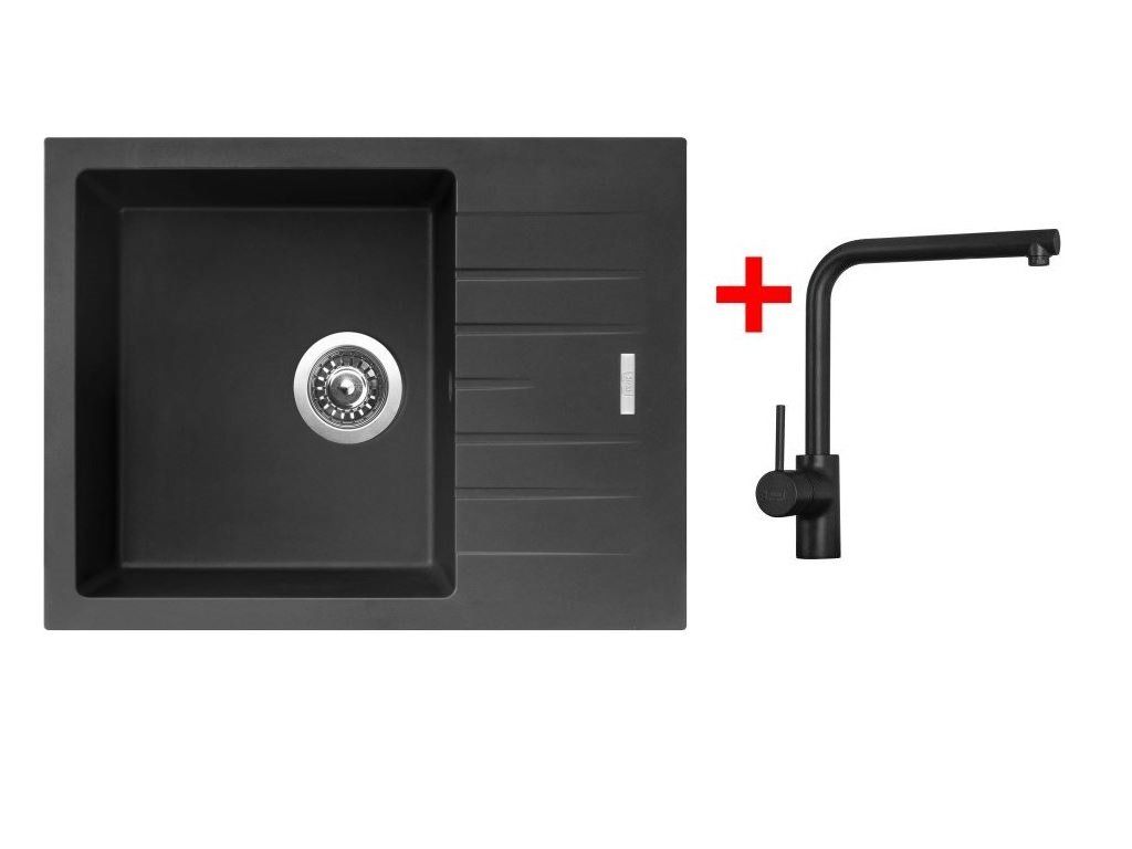 Set obsahuje dřez PERFECTO 650 Pureblack s odkapem + baterii ELKA černá matná