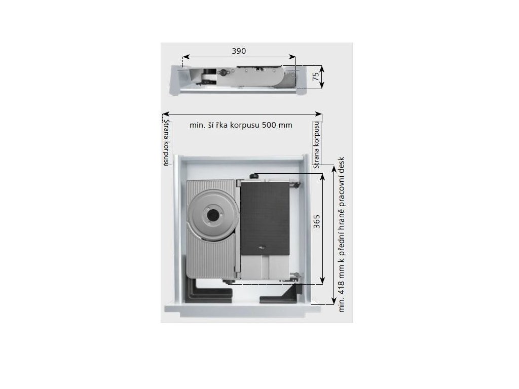 - potřebná délka prostoru při vysunutí zásuvky: min. 418 mm (od hrany korpusu po vnitřní stranu čela)
