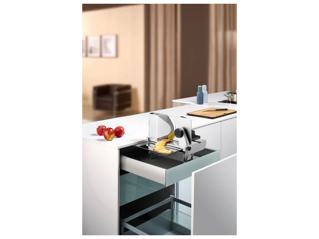 Tloušťku řezu lze plynule nastavit až do 14 mm. Nakrájené suroviny padají přímo do praktické misky z leštěné nerezové oceli.
