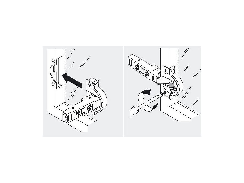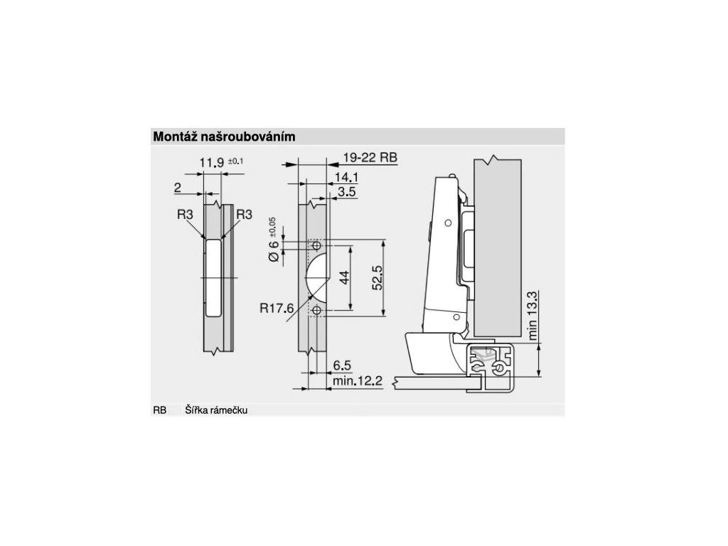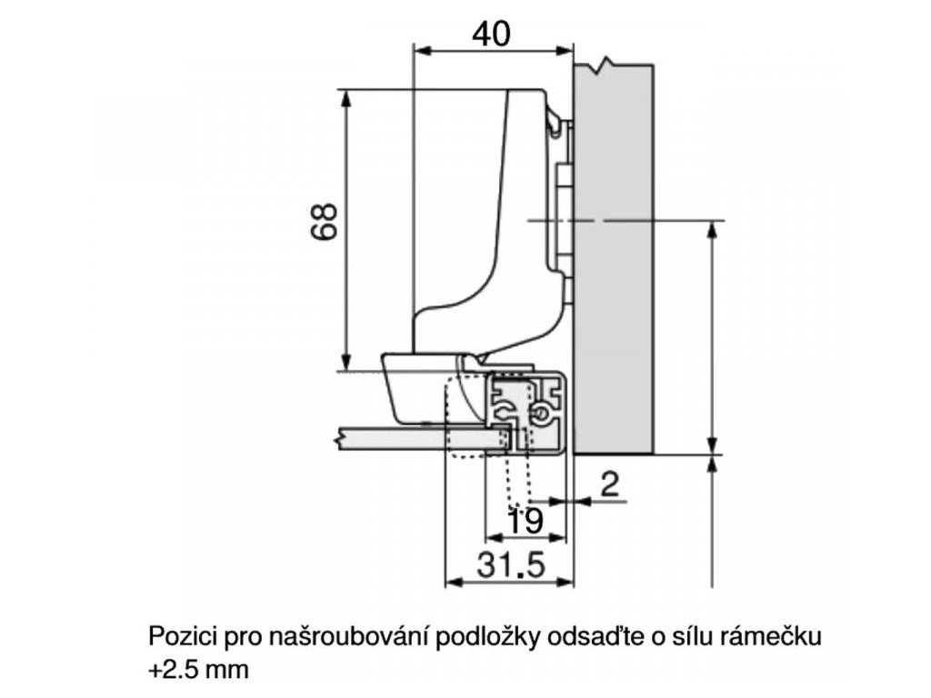 Clip Top závěs s úhlem otevření 95° naložený pro úzké hliníkové ALU rámečky s dotlumením.