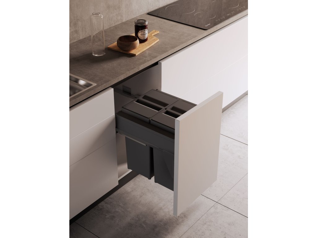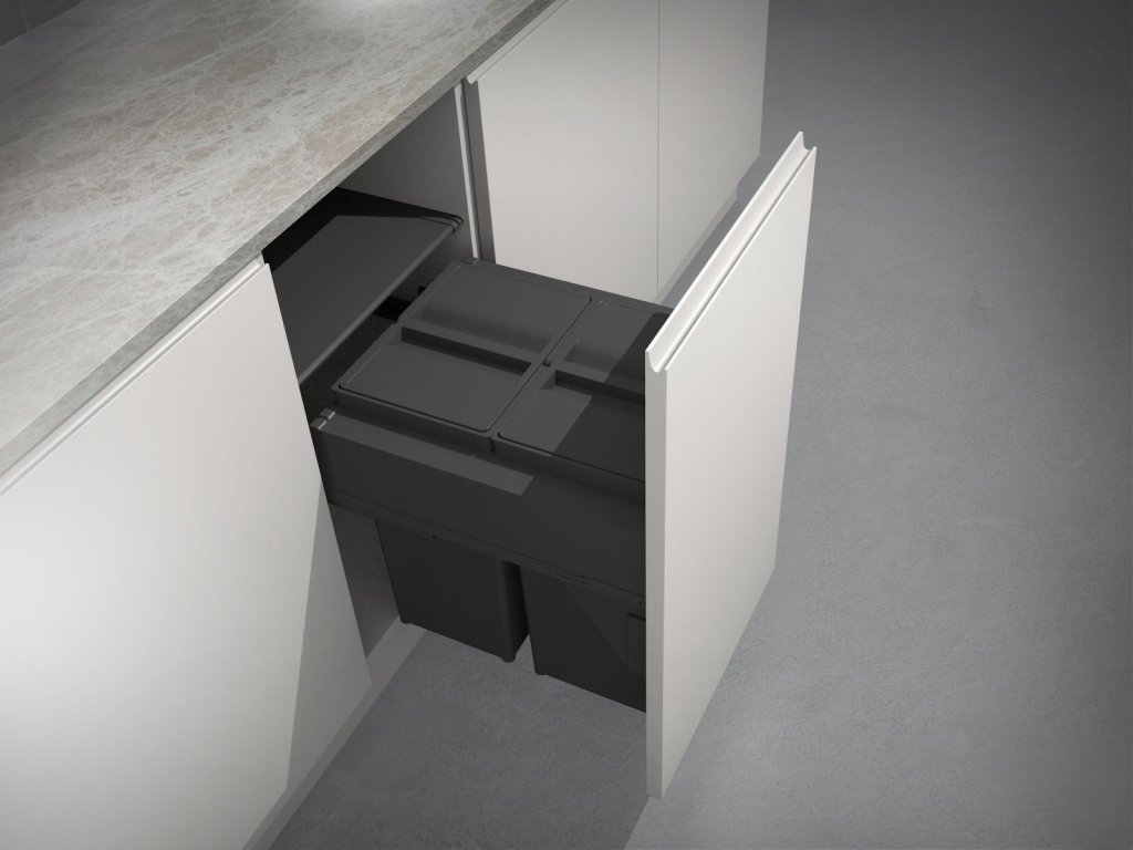 Velkokapacitní výsuvný zabudovaný odpadkový koš na tříděný odpad.