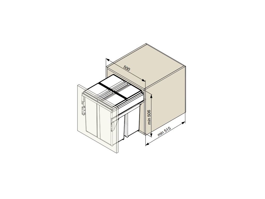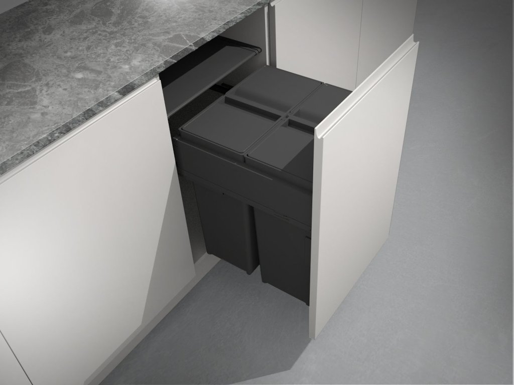 Velkokapacitní výsuvný zabudovaný odpadkový koš na tříděný odpad.
