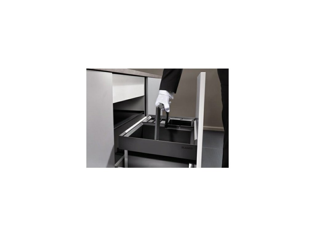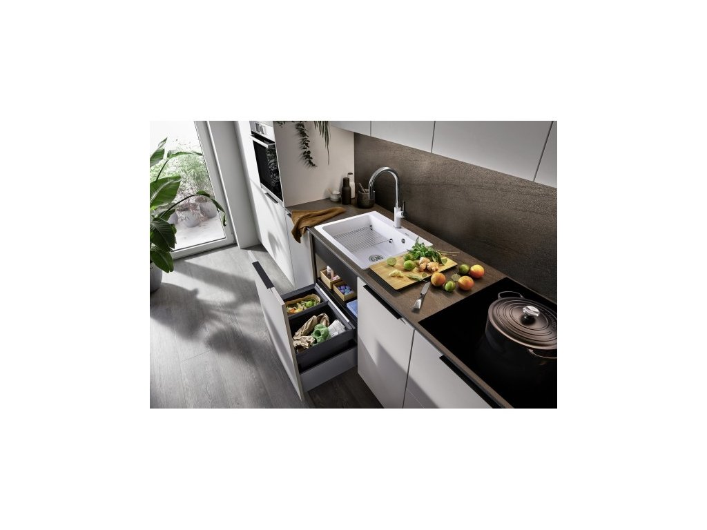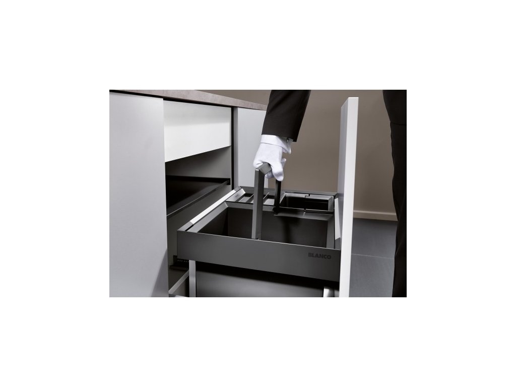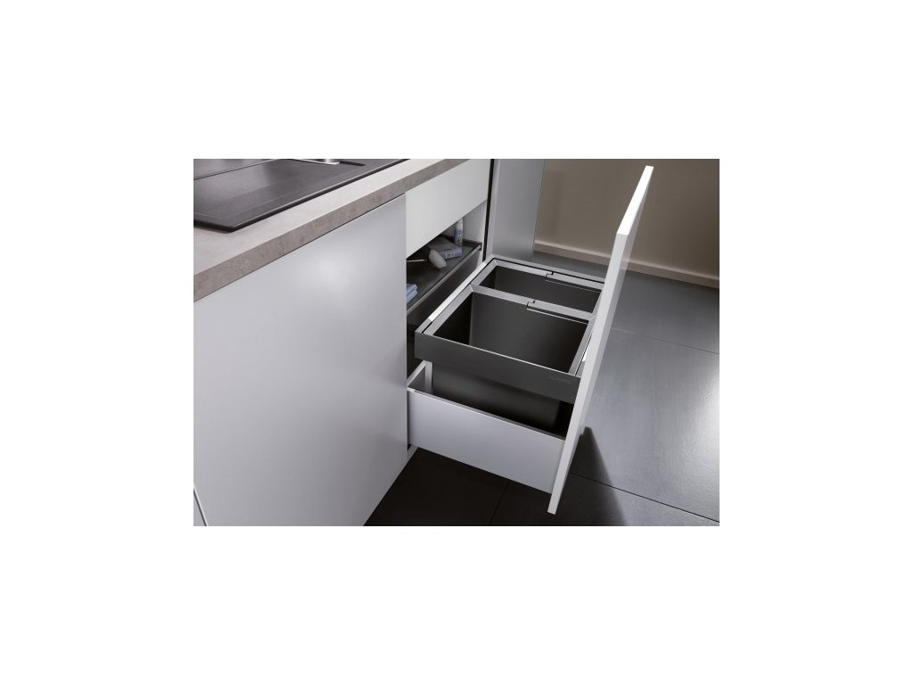 Odpadkový vestavěný koš s čelním výstupem, který přináší dokonalou kombinaci praktičnosti a moderního designu. S dvěma nádobami o objemu 30 a 19 litrů přičemž každá poskytuje dostatek místa pro vaše odpadky. Blanco Flexon II se vejde do skříňky o šířce 60 cm. Koš se sklápějícím madlem zajišťuje plynulý a bezproblémový provoz.