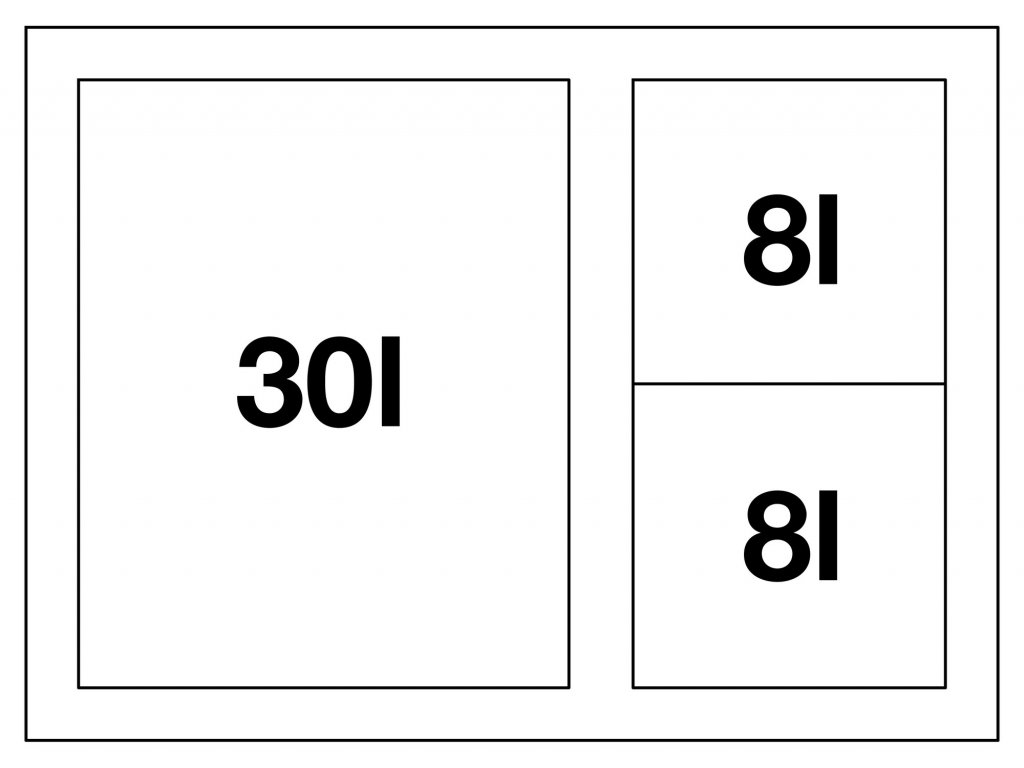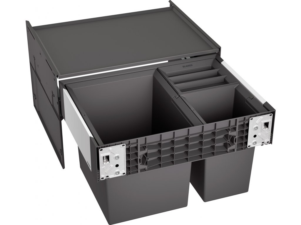 Odpadkový vestavěný koš s čelním výstupem, který přináší dokonalou kombinaci praktičnosti a moderního designu. Se třemi nádobami o objemu 1x30 a 2x8 litrů přičemž každá poskytuje dostatek místa pro vaše odpadky. Blanco Select XL se vejde do skříňky o šířce 60 cm. Kvalitní plnovýsuv s tlumením a nosností až 50 kg zajišťuje plynulý a bezproblémový provoz.