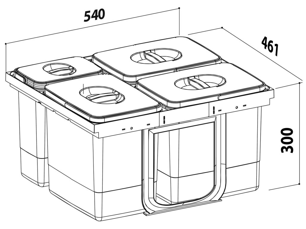Celkový objem nádob koše: 52 L, Objem jednotlivých nádob koše: 15 L, Počet nádob koše: 4
