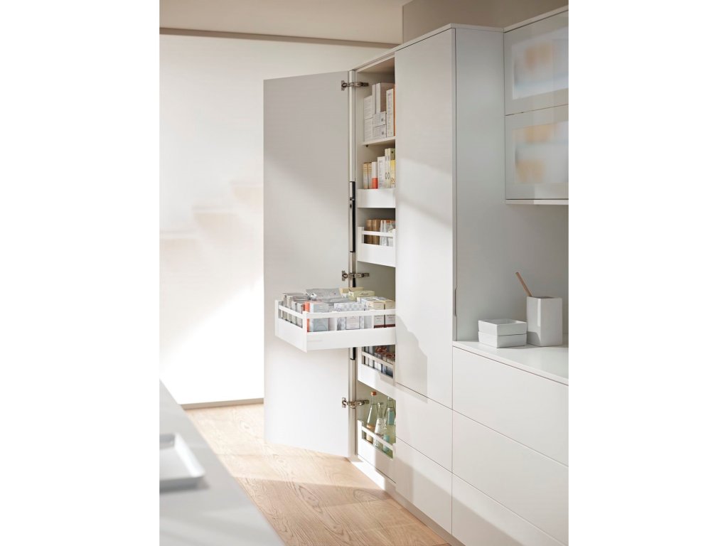 Blum Space Tower byl sestaven dle aktuálních potřeb zákazníka. Potravinová skříň je vhodná kamkoli, kde je potřeba uskladnit větší množštví věcí. Díky kvalitnímů kování od značky Blum si kupujete garanci kvality, která se projeví v tichém a bezproblémovém chodu výsuvů, kvalitně zpracovaném designu a možnosti zatížit jednotlivé zásuvky až do hmotnosti 30 kg.