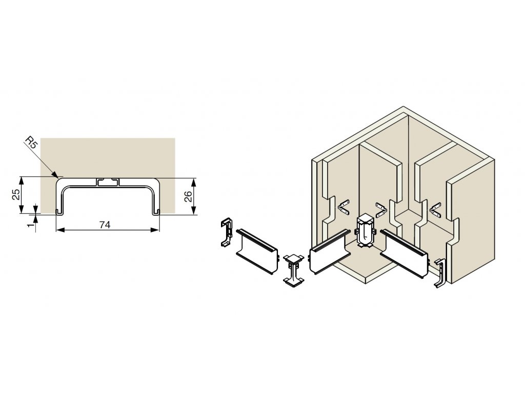 Jde o EKO variantu, která se nesmí kombinovat s jinými typy C profilů. Profil je možno zkrátit dle potřeby (šířky korpusu) a na jeho konce lze dokoupit koncovky. Nutno dokoupit kovové uchycení k profilům a v případě potřeby koncovky, roh vnější a vnitřní.