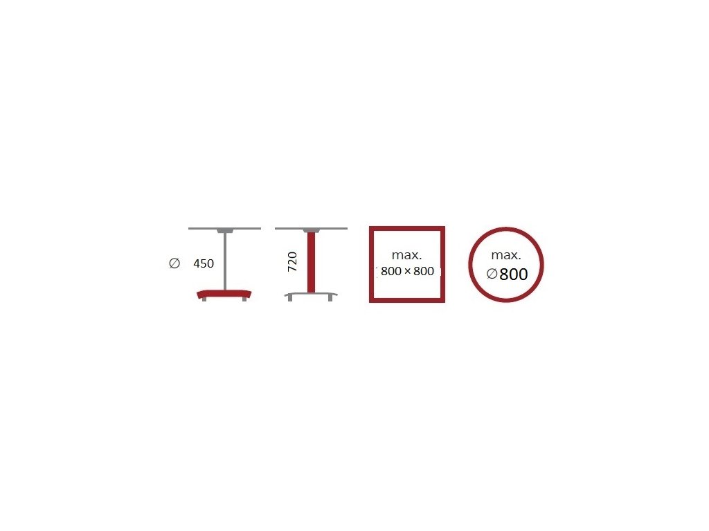 S základnou o průměru 450 mm a výškou 720 mm je tato noha ideální pro interiérové použití. Maximální podporovaná velikost stolové desky je 800x 800 mm nebo průměr 800 mm. Základna je vybavena filcovými kluzáky pro snadné a bezpečné posouvání stolu bez poškrábání podlahy. S masivní a těžkou konstrukcí zajistí stabilitu stolu. Tato noha není možné zkracovat.