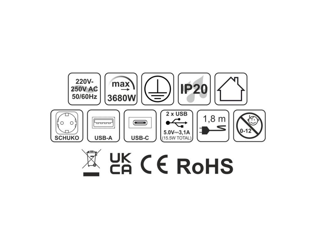 Zásuvka je vyrobena z hliníku a plastu a je vybavena napájecím kabelem o délce 1,8 m zakončeným euro zástrčkou.