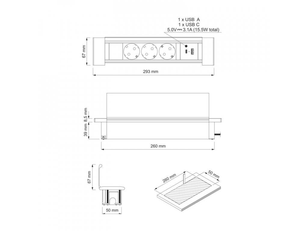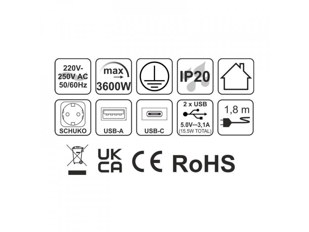 Obsahuje: | USB-A, USB-C, 3x230V |