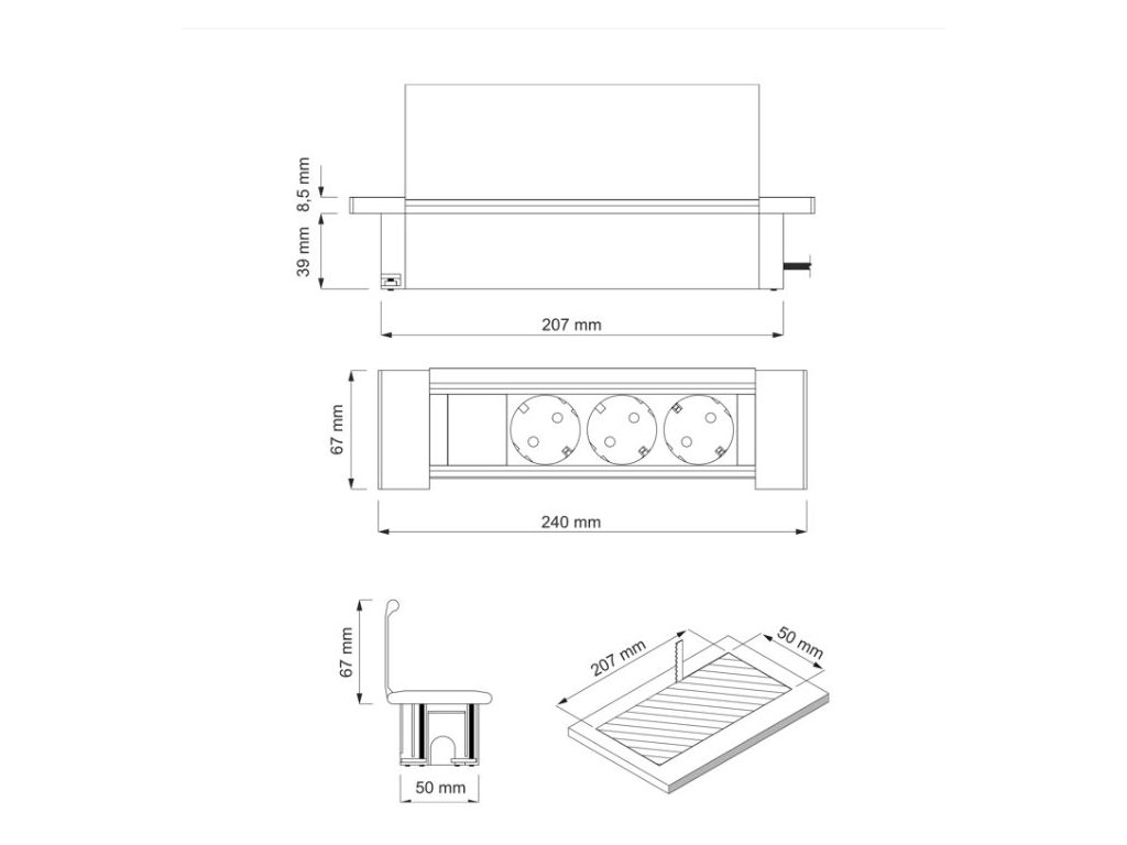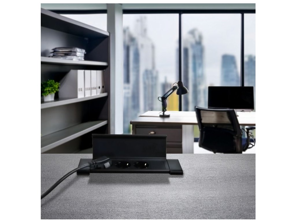 Posuvné víko umožňuje snadný přístup k zásuvkám - 3x zásuvka Schuko (230 V AC, max. 16 A/3680 W).