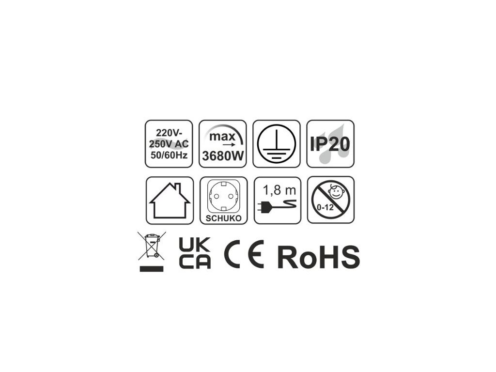 Zásuvka je vyrobena z hliníku a plastu a je vybavena napájecím kabelem o délce 1,8 m zakončeným euro zástrčkou.