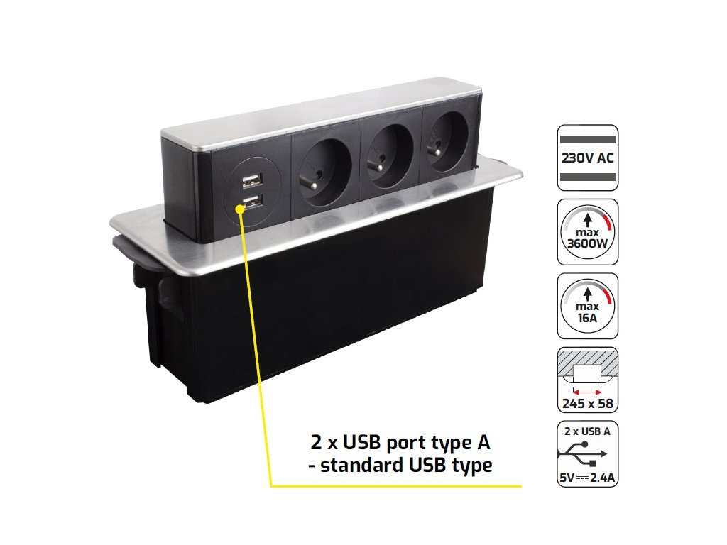 | Obsahuje: | USB-A, USB-C, 3x230V |