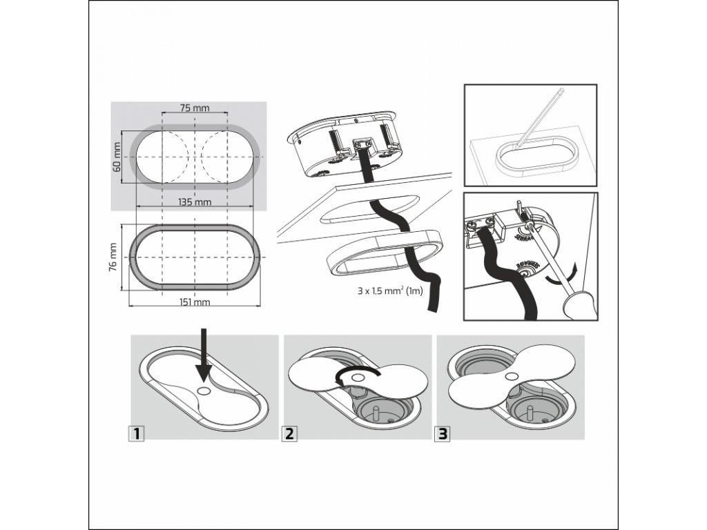 Montážní otvor: ovál 60 mm x 135 mm