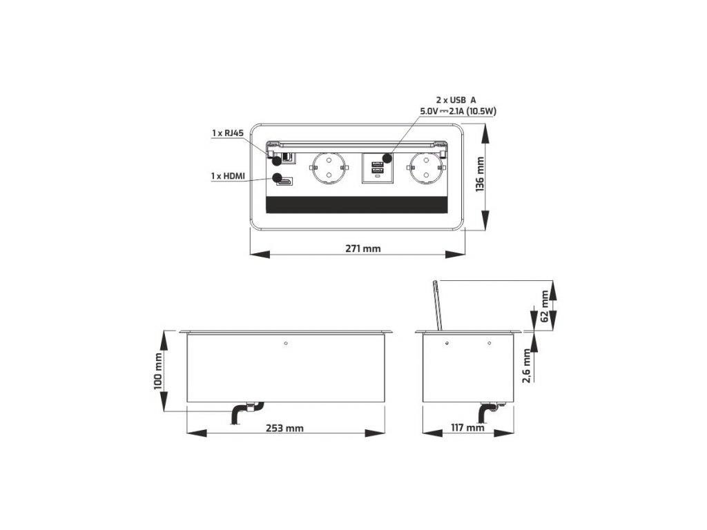Zásuvka INBOX je díky zapuštění do pracovní desky stěží viditelná a nebude tím pádem kazit design Vašeho pokoje. Na elektrozásuvku je moýné připojit zařízení jako jsou například notebooky, monitory, DVD sestavy nebo chytré telefony. Díky speciální úpravě můžete uzavřít kryt bez nutnosti odpojovat již připojená zařízení.