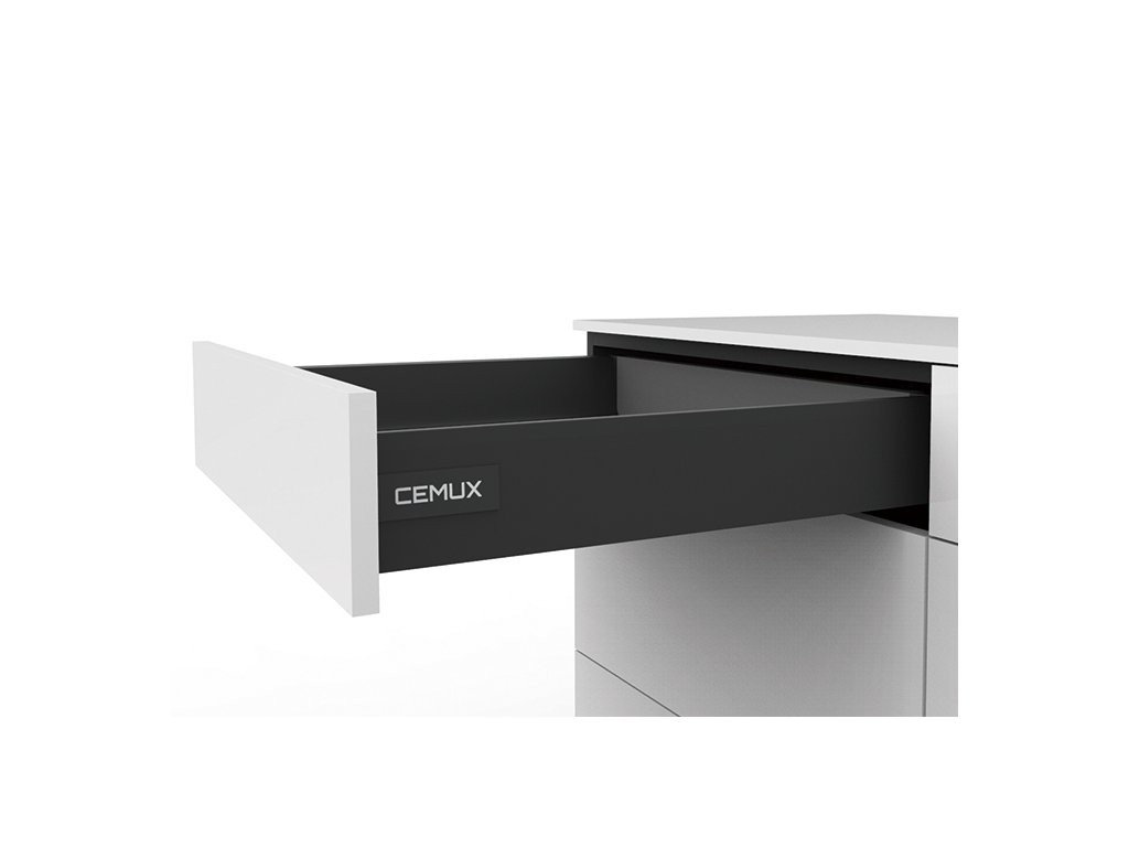 Zásuvka Cemux A Box je navržena s důrazem na funkčnost a kvalitu. Je vybavena dutou bočnicí a integrovaným plynulým dotlumením Soft-close, které zajišťuje tiché a plynulé zavírání. Dno a záda zásuvky jsou vyrobeny z DTD materiálu o síle 16 mm, který poskytuje stabilitu a odolnost. Zásuvka má nosnost až 40 kg a nabízí možnost přesného seřízení čela zásuvky jak horizontálně, tak vertikálně. Elegantní barva antracit dodá každému interiéru moderní vzhled. Výsuvy s tlumením byly testovány na 80 000 cyklů, což garantuje dlouhou životnost.