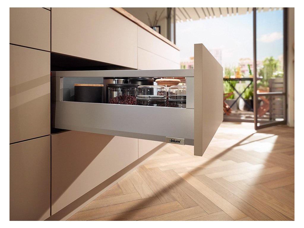 Sadu kování pro zásuvku s dutou bočnicí a relingem od firmy BLUM Merivobox využijete při výrobě šuplíků v kuchyni pro odpadkový koš díky předsazenému výsuvu na 70 kg.